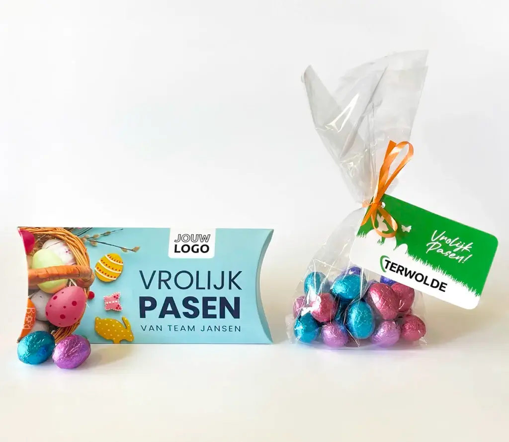 Voeg een bedrukt kaartje toe en maak van een simpel Paasgeschenk een persoonlijke verrassing. Perfect voor collega’s, relaties en medewerkers.