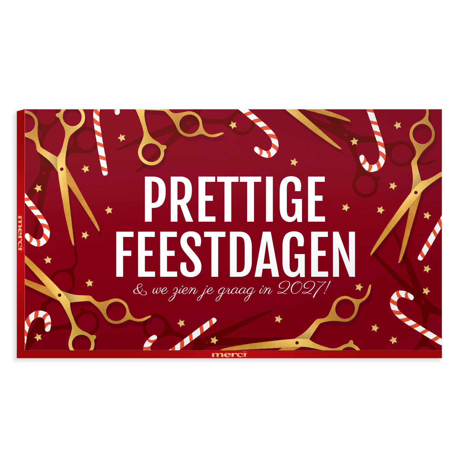 Een opvallend en creatief eindejaarsbedankje voor bedrijven in de kappers- of beautybranche. Deze kaart combineert een diepe rode achtergrond met goudkleurige scharen, zuurstokken en kleine sterretjes. De opdruk luidt: Prettige feestdagen.