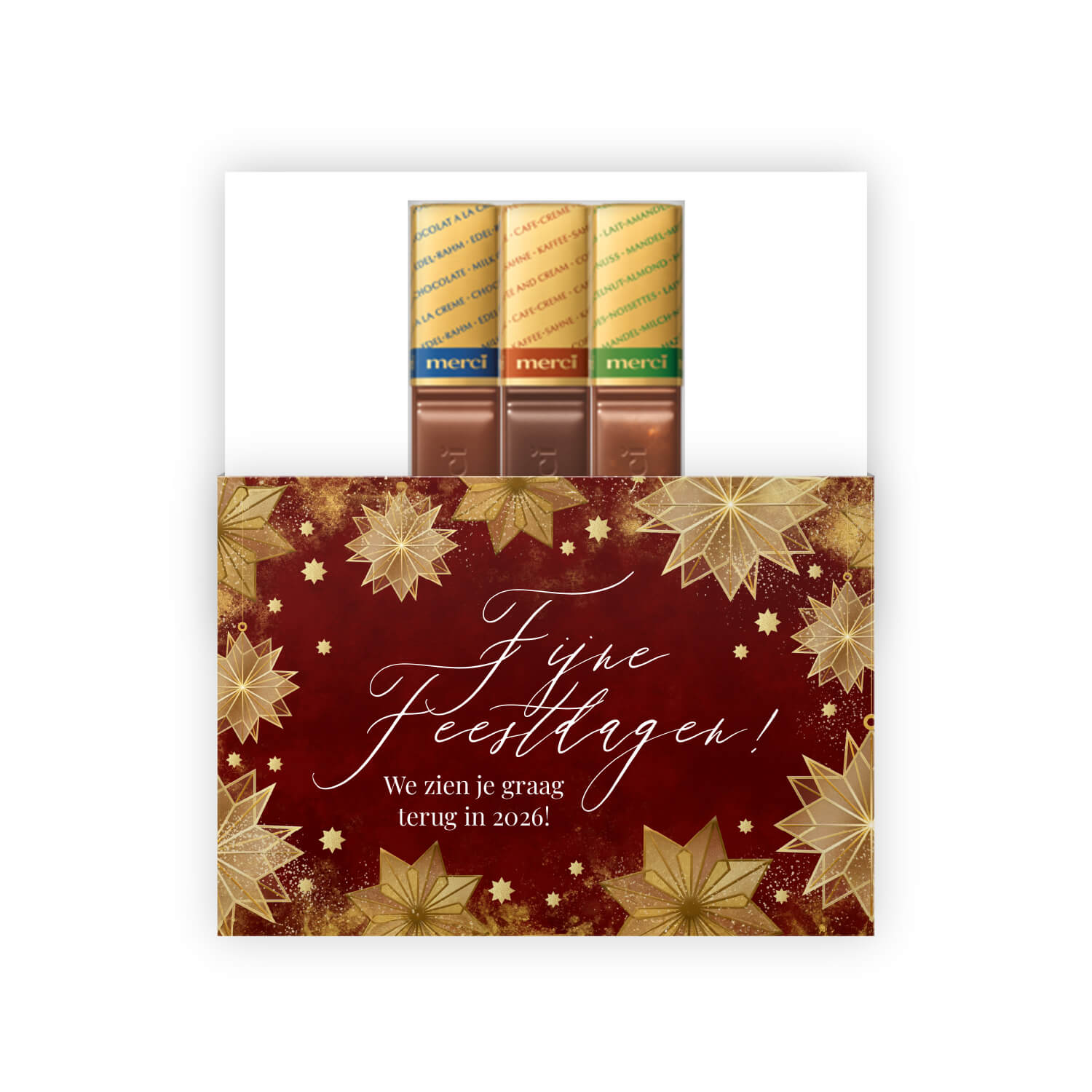 Op zoek naar een sfeervol kerstbedankje? De Merci Minibox 3 bedankjes zijn precies wat je nodig hebt! Deze kerstbedankjes omvatten 3 verrukkelijke Merci chocolaatjes, elk met een gewicht van 12,5 gram, afkomstig uit de verleidelijke rode assorti collectie van Merci. De verpakking straalt pure elegantie uit en is volledig te personaliseren met je eigen tekst, kleuren en zelfs je bedrijfslogo.