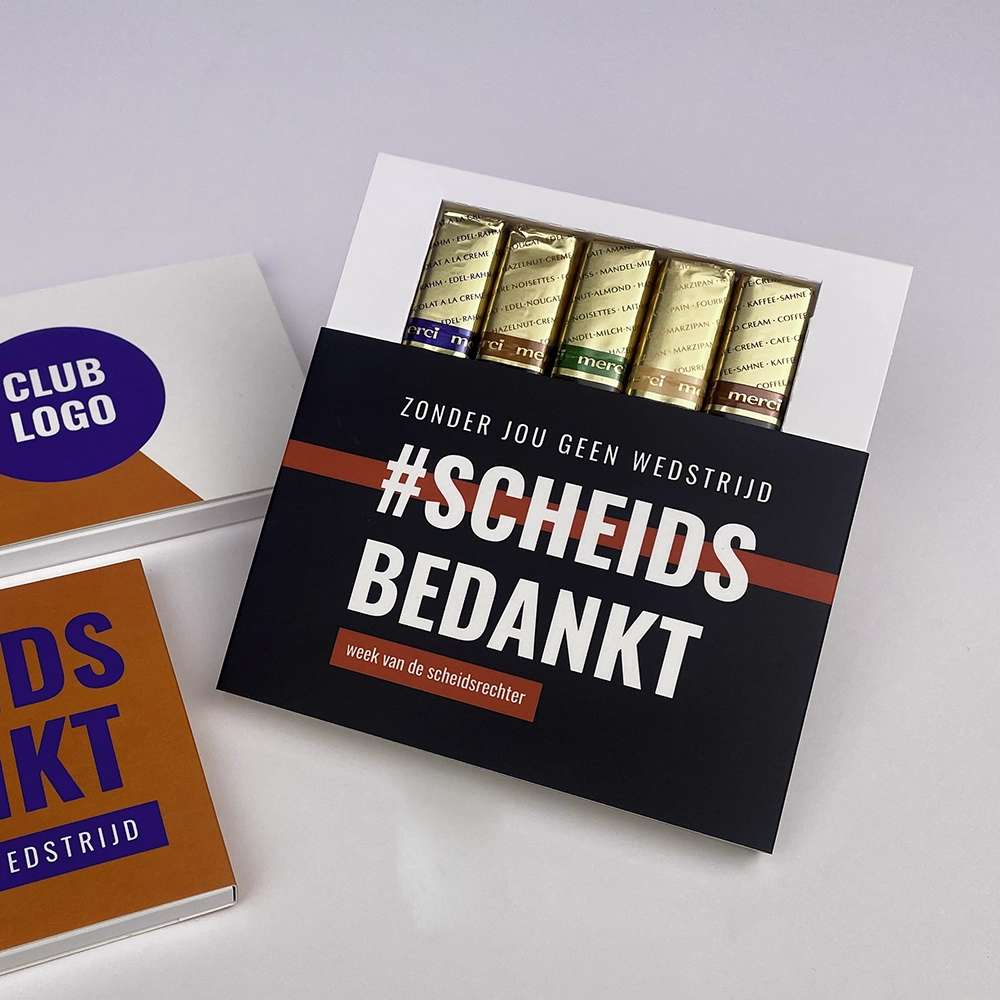 Bedank de scheidsrechters van de club met deze persoonlijk bedrukte bedankjes met 5 Merci chocolaatjes. Voorop een sprekende opdruk achterop voldoende ruimte voor een persoonlijke tekst en het logo van de club. Toon je waardering aan de scheidsrechters! #scheidsbedankt