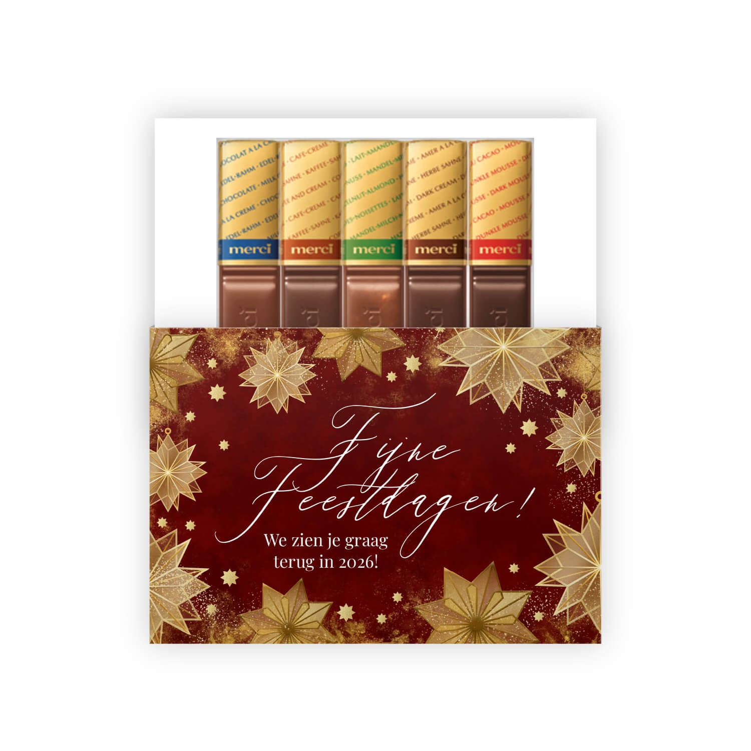 Op zoek naar een sfeervol kerstbedankje? De Merci Minibox 5 bedankjes zijn precies wat je nodig hebt! Deze kerstbedankjes omvatten 5 verrukkelijke Merci chocolaatjes, elk met een gewicht van 12,5 gram, afkomstig uit de verleidelijke rode assorti collectie van Merci. De verpakking straalt pure elegantie uit en is volledig te personaliseren met je eigen tekst, kleuren en zelfs je bedrijfslogo.