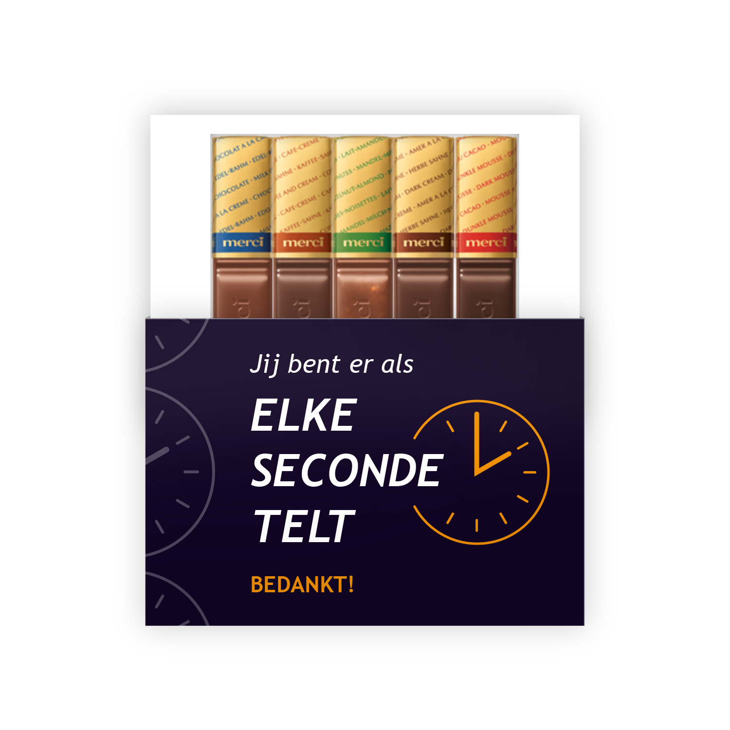 De donkerblauwe verpakking met oranje klokicoon en moderne typografie straalt rust, daadkracht en waardering uit. Binnenin vind je vijf heerlijke Merci chocolaatjes (12,5 g per stuk) uit de populaire rode collectie. Het compacte uitschuifdoosje is stijlvol, professioneel en direct uitdeelbaar.